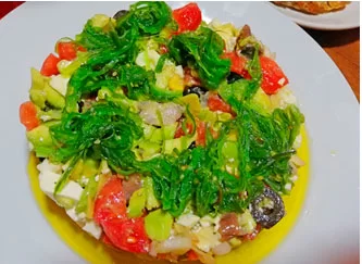 Dejamos reposar la mezcla 5 minutos mientras preparamos la base sobre la que serviremos el tartar de atún. A vuestra elección podéis poner una ensalada de wakame con sésamo -como he hecho yo-, podéis cortar un buen tomate (pelado previamente) en dados o bien poner una base de aguacate cortado en dados.
